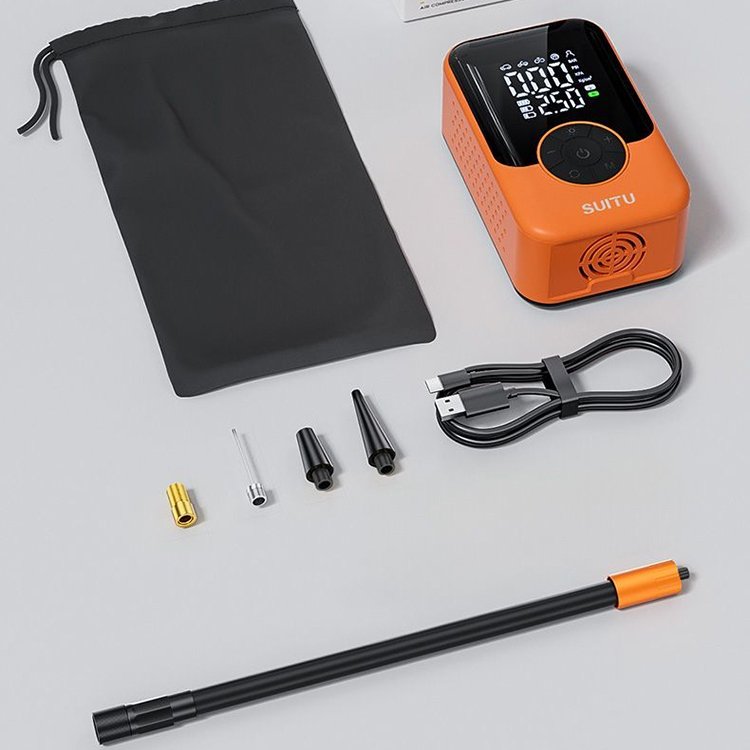 Portable Tire Inflator & Air Compressor, lightweight and compact for on-the-go use. Universal compatibility with bicycle, car, motorcycle tires and all kinds of sports balls. Fast inflation, easy operation, essential travel and outdoor accessory for quick tire and ball inflation needs.