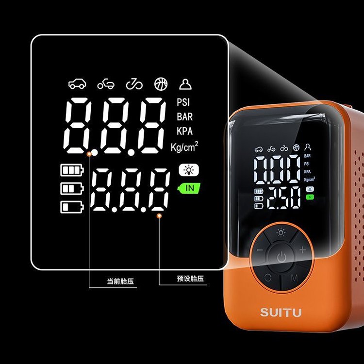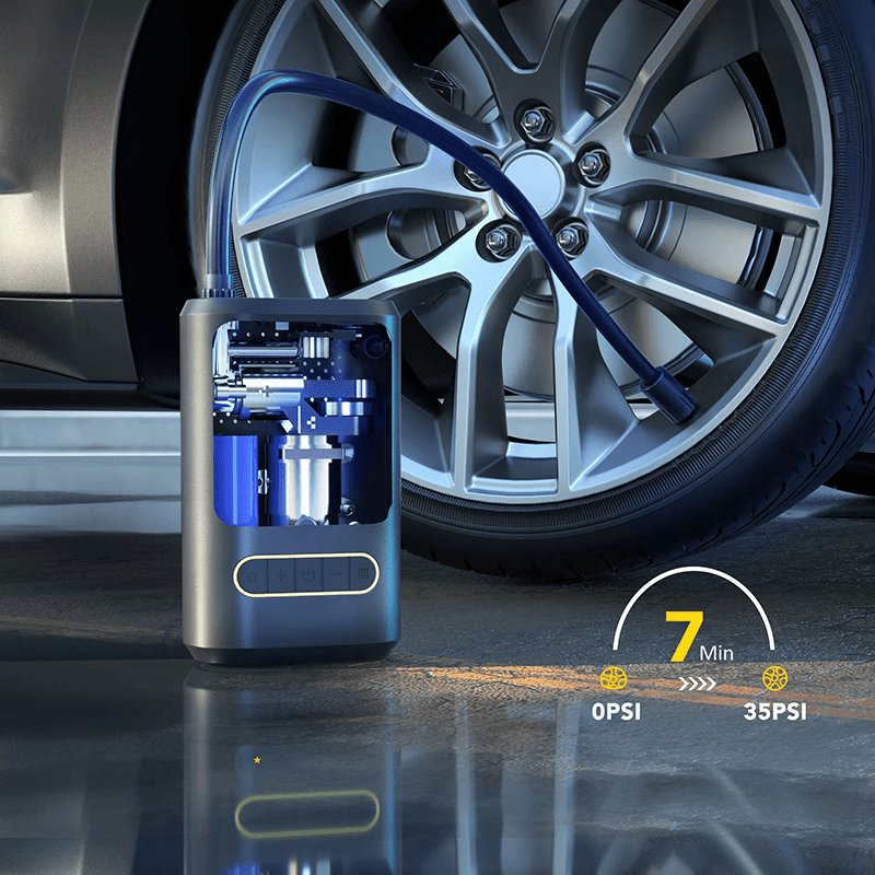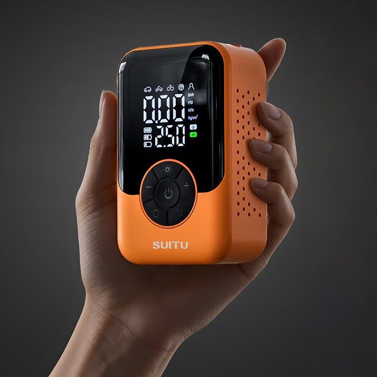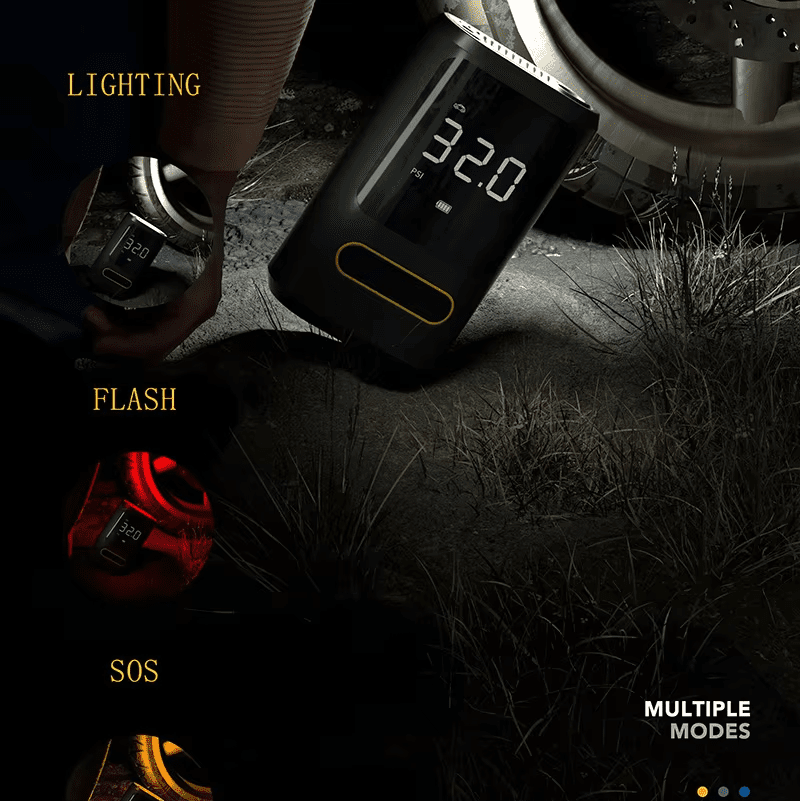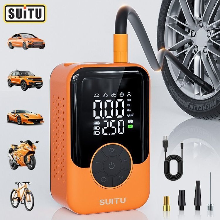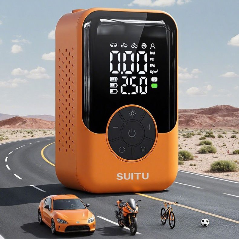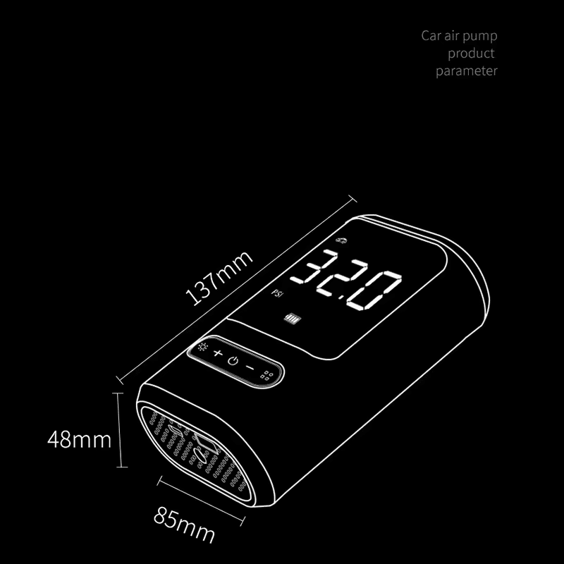 Portable Tire Inflator & Air Compressor, lightweight and compact for on-the-go use. Universal compatibility with bicycle, car, motorcycle tires and all kinds of sports balls. Fast inflation, easy operation, essential travel and outdoor accessory for quick tire and ball inflation needs.